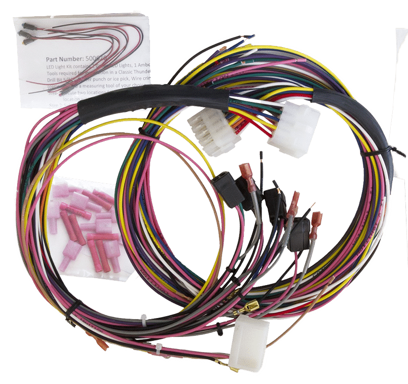 - Includes: Main Wire Harness (gauge side and vehicle side with pre-terminated multi-pin separation connectors), Lighting Ground Wire Harness, 8 butt connectors, 8 crimp connectors, 2 green turn signal LEDs, 1 blue high beam LED, 1 red brake or check engine LED.