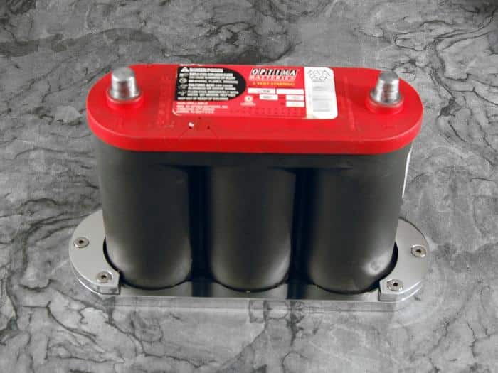 Billet aluminum battery tray for 6 volt Optima (machined finish). The base is machined from 1/2″ T6061 billet aluminum. Brackets are machined from 3/8″ T6061 billet aluminum. Footprint measures 12″ x 4″.Additional information